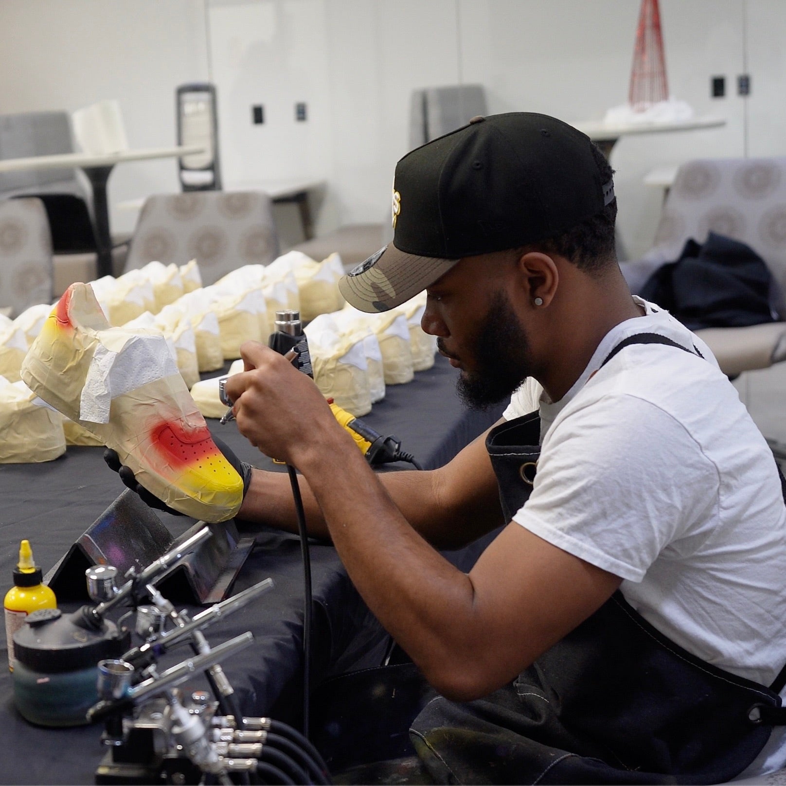 The first thing we’ll need is a brief describing what you are looking for. This can include the base shoe you are wanting to use, a design idea (if you don’t have one don’t worry! We can help with this) along with a deadline if you have one. Any information on the project you can share will be helpful to us! We can then start mocking some designs up for you and once you’re happy with the design the order can be placed and the team can begin creating your customs!